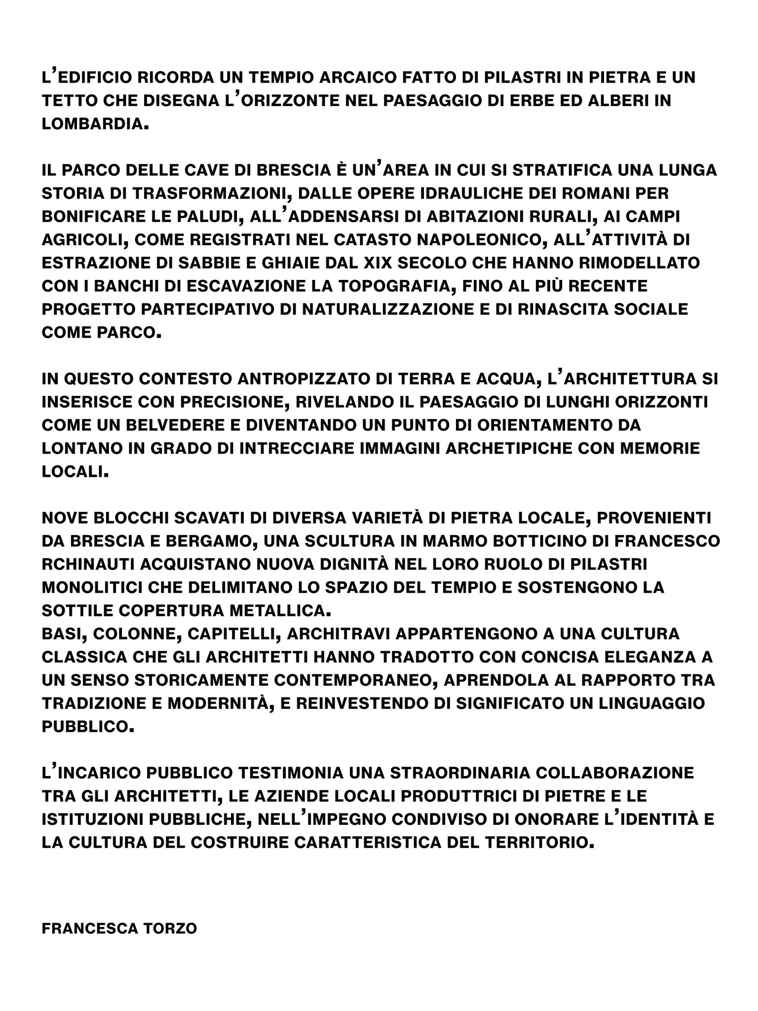 Siamo orgogliosi di aver contribuito a un progetto che ne racconta l’essenza con tanta sensibilità e visione, donando due dei blocchi monolitici di Botticino Classico: uno sorregge la copertura del padiglione e l’altro ospita una scultura dell’artista Francesco Paterlini dal nome “Madrecava”.