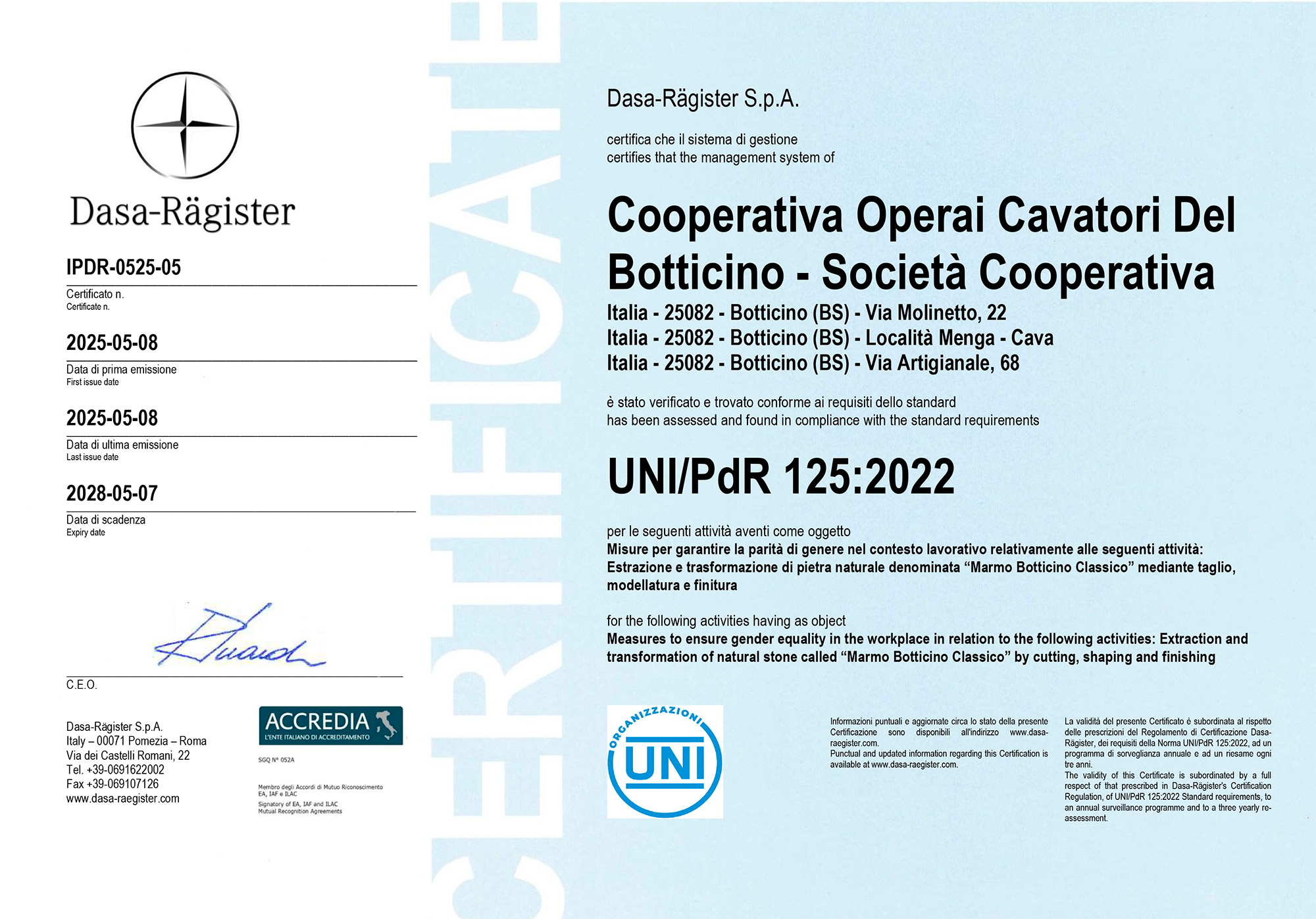 Кооператив Operai Cavatori del Botticino получил в мае 2025 года сертификат гендерного равенства, выданный аккредитованным органом в соответствии со стандартом UNI/PdR 125:2022.